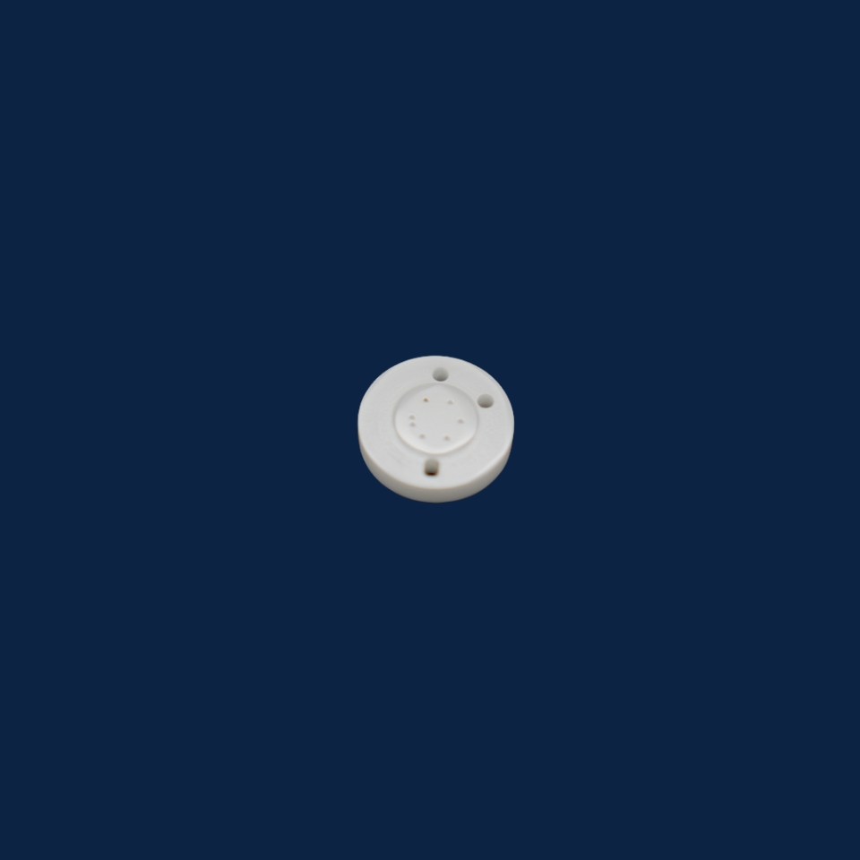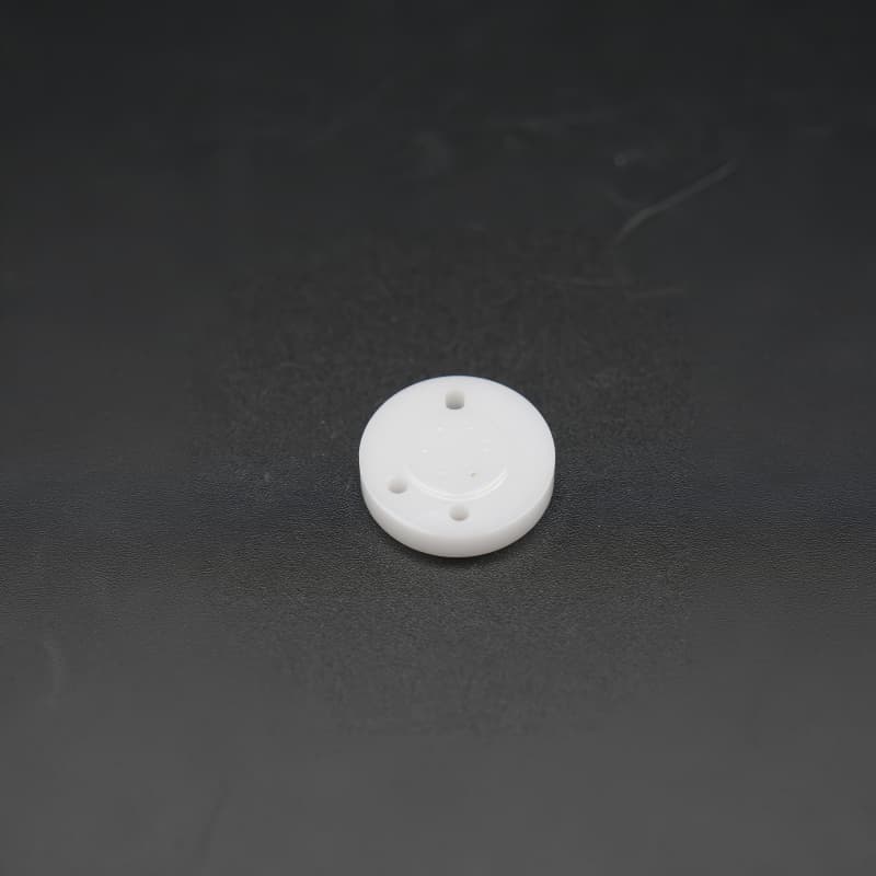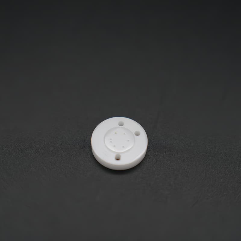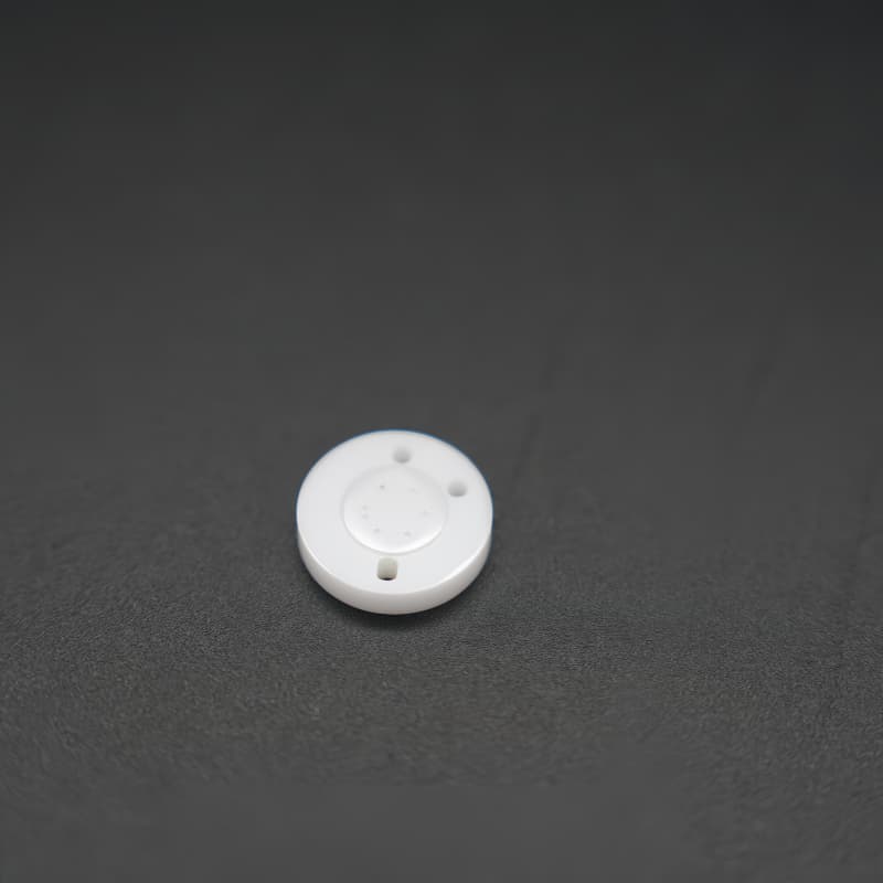 精密陶瓷閥芯(片)采用高純度氧化鋁(Al?O?≥99%)或氧化鋯(Y-TZP)陶瓷制成,呈白色圓片狀,表面光滑如鏡(Ra≤0.05μm),中心區域分布精密凸起結構,邊緣設有兩個對稱流體通孔(孔徑Φ1-3mm)。
